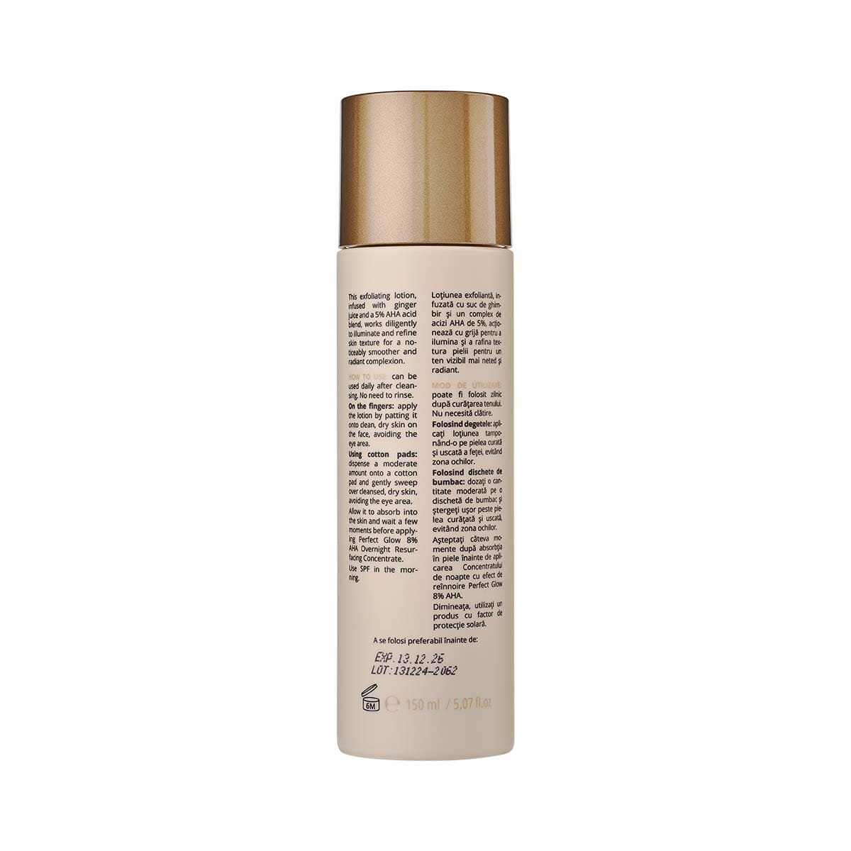 Loţiunea exfoliantă, infuzată cu suc de ghimbir şi un complex de acizi AHA de 5%, acţionează cu grijă pentru a ilumina şi a rafina textura pielii pentru un ten vizibil mai neted şi radiant.